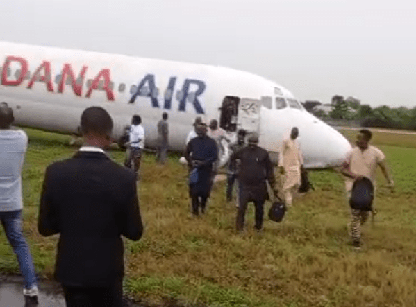 A yayin da ake ruwan sama ne wani jirgin fasinja jirgin mallakin kamfanin Dana Air ya zame daga kan titinsa a filin jirgi na Murtala Muhammad da ke Legas, sannan ya ci kasa a cikin jeji.